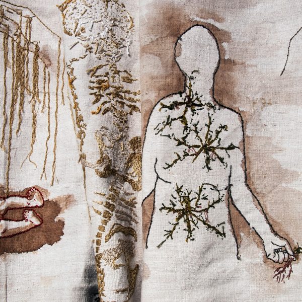 A nyelv a vezérfonál Richter Sára alkotásainál is. Ismerjük lírai hangvételű hímzett könyveit, ahol az öltés gesztusa pontosabban követi az adott vers belső hangját, mint bármilyen más médium. Erőteljes, drámai színei, képi asszociációi, kontúrvonalainak folytonossága, szaggatottsága vagy hiánya mind ugyanazon grammatika részei. Sokszor érzem úgy Sára hímzett vers könyveit olvasva, ezek után tilos volna verset mondani. De hímzett önreflexív munkáival ugyanez a helyzet, legyen az végeláthatatlan szalag, vagy egy vég régi nyersvászon.(…)